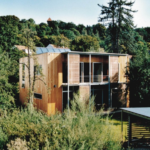 Das Energiesparhaus in Erlangen liegt zentrumsnah und doch ruhig am Ufer der Schwabach. Das Splitlevel Gebäudekonzept des Holzhauses mit zwei zueinander versetzten Baukörpern macht die unterschiedlichen Funktionen formal wie funktional bereits von Außen klar ablesbar. Ein großzügiges, zentral gelegenes Treppenhaus teilt den größeren nach Süden orientierten Wohntrakt vom im Norden zur Schwabach hin liegenden Arbeits- und Versorgungstrakt.